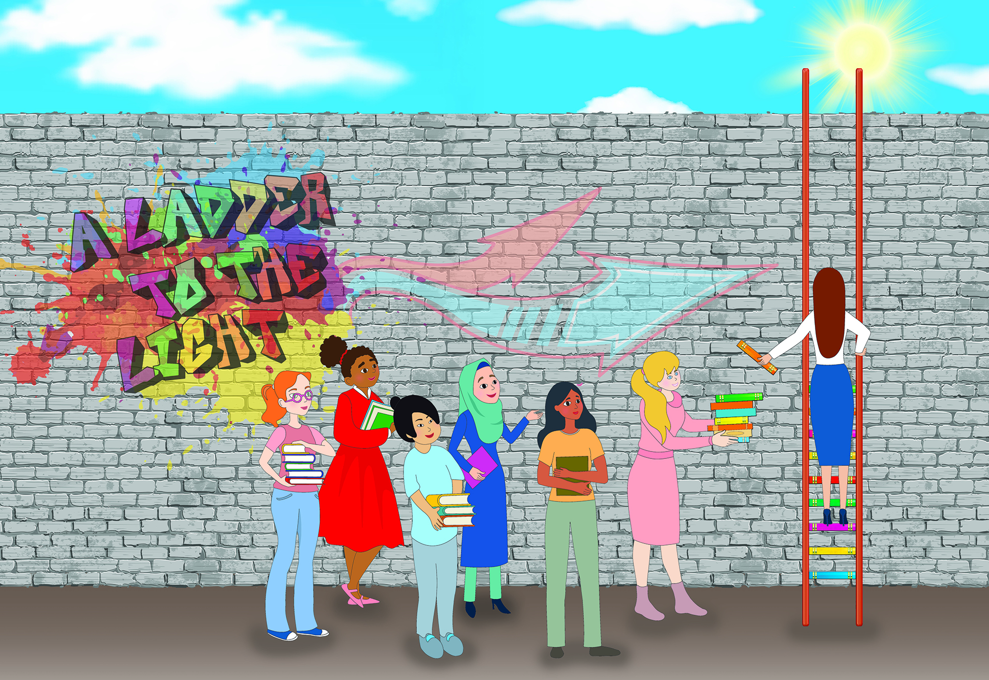 In this digital art work, I depicted women of different nationalities with different cultures and clothing who are building a ladder to reach the other side of the wall. The steps of this ladder are made of books. I want to emphasize the role of studying and learning in the growth and empowerment of women. The wall symbolizes the obstacles and challenges women face in their lives, including gender and social inequality, discrimination, lack of access to education and employment, gender-based violence, poverty, etc. I wanted to point out that women all over the world will be able to overcome existing obstacles by cooperating and participating with each other (regardless of differences), through education and increasing their awareness. They can create a bright and hopeful future for themselves and their society, and they can live their dreams by following their goals and values.