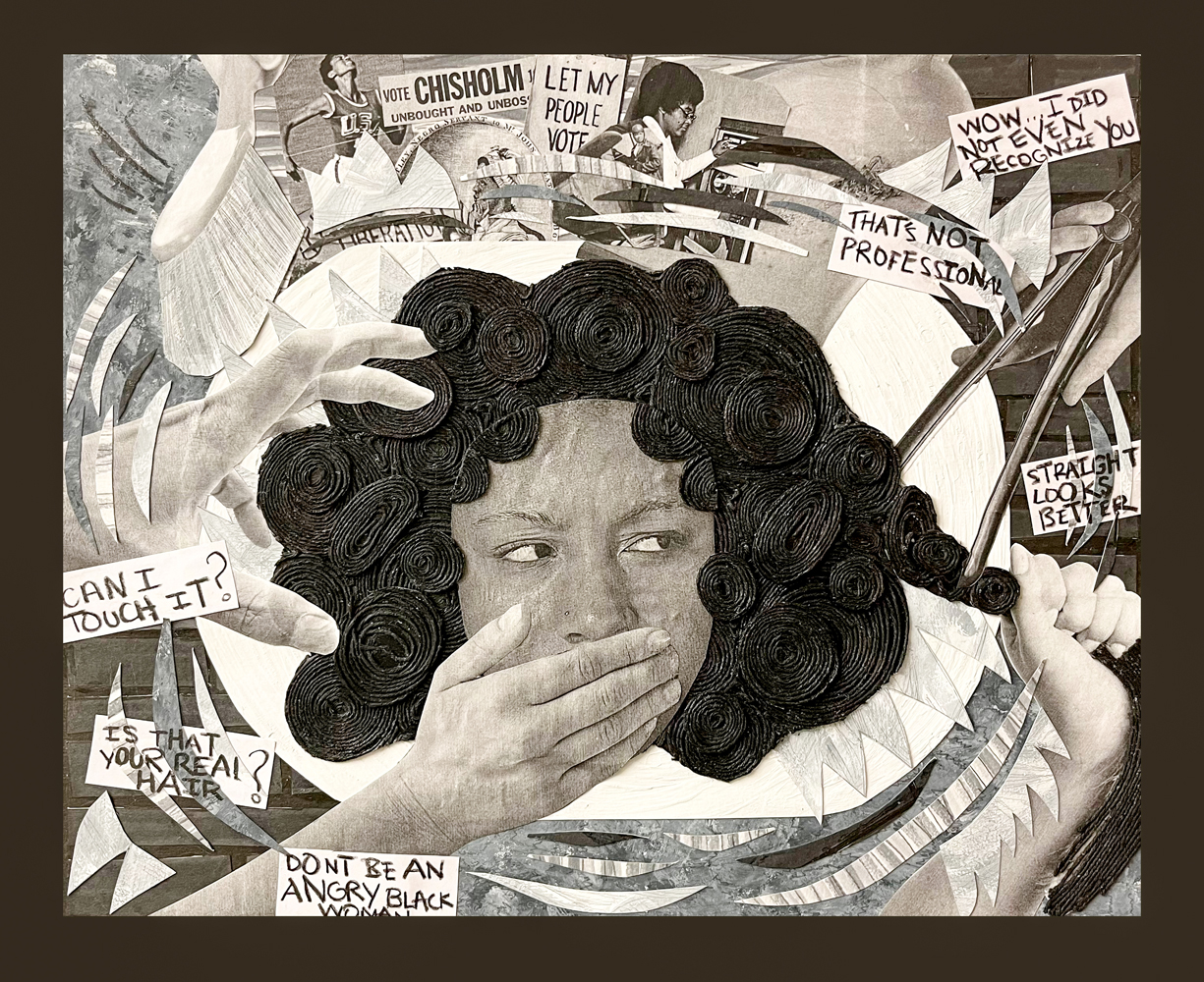 In this work I wanted to demonstrate the daily struggles that Black women in America encounter. This work is very special to me because I incorporated comments that have specifically been said to me. I also included very important Black women in America who have been swept under the rug by society. I created this work to bring these issues to light. This work is a collage using twine, paint, construction paper, and markers.