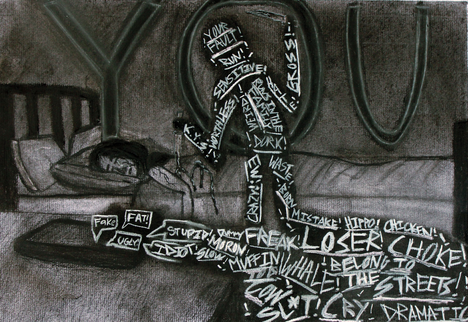 I wanted to show the devastating effects of cyber-bullying in this piece of art, in a vivid and compelling way. The painting shows a girl who is carrying the agonizing burden of cyberbullying, which follows her even while she sleeps. The artwork's visual representation of the evil force coming from her phone, which represents the terrible nature of internet abuse, is its most striking feature. This invisible evil entity appears to pierce the girl with a dagger. The wounds caused by the violence are powerfully represented by emotional visuals. The artwork depicts the eerie memory of the inner sadness she experienced in the background. The wounds of the terrible words she saw before falling asleep. This art reflects the terrifying and systemic effects of cyberbullying by immersing the audience in the girl's terrible experience.