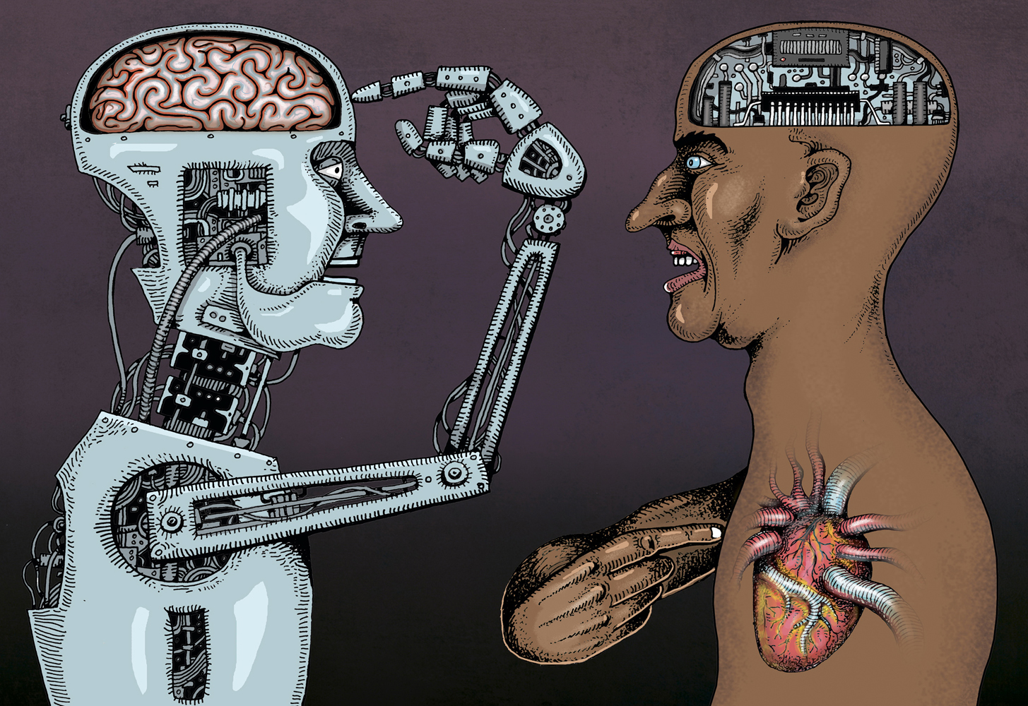My drawing reflects the era of high technology and artificial intelligence, an era in which a person will increasingly acquire the features of a robot, and the robot will become more and more humanized. Someday the time will come when the differences between them, both physiological and mental, will practically disappear and philosophers will again begin discussions about what a person is, what is the meaning of his existence, and the motto “Liberty Equality Fraternity” from the time of the Great French Revolution will be filled new meaning and sparkle with fresh colors.