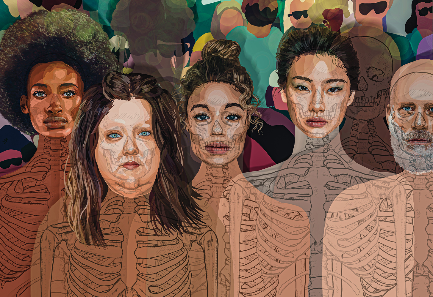 Shared Core, Individual Layers is a digital artwork created on the premise that in a crowd, we can find many similarities and differences depending on the perspective and how deep we look. Our differences make us unique, but we can always find points of convergence with others. This digital artwork showcases these differences, including ethnicity, age, weight, gender, and skin color, but it also focuses on our shared core, metaphorically portrayed through the X-ray, which to the majority appears the same. With an X-ray vision, would we really see differences? The beauty of diversity in the crowd lies precisely in embracing differences and observing the similarities that unite us.