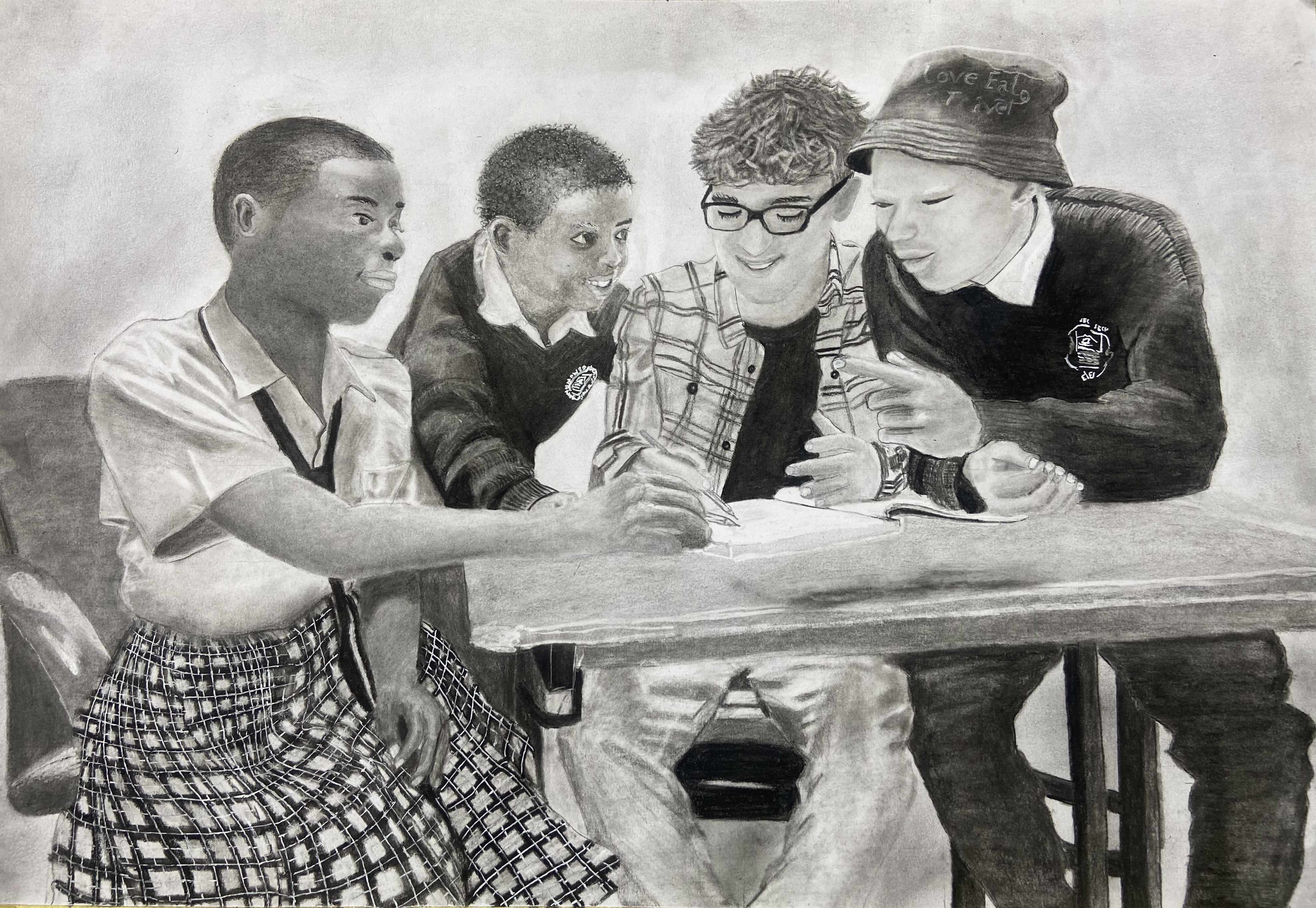 I am a 14-year-old student taking Fine Arts in my school located in Northern Tanzania. I am currently working in pencil drawing. My piece of work was inspired by Janick, a volunteer in our school from Germany. He has been very social since he came to our school, and he always comes to the fine art room with us. As you can see in my artwork, there are different student genders, and one of the fine arts students is albino, and they enjoy being together.