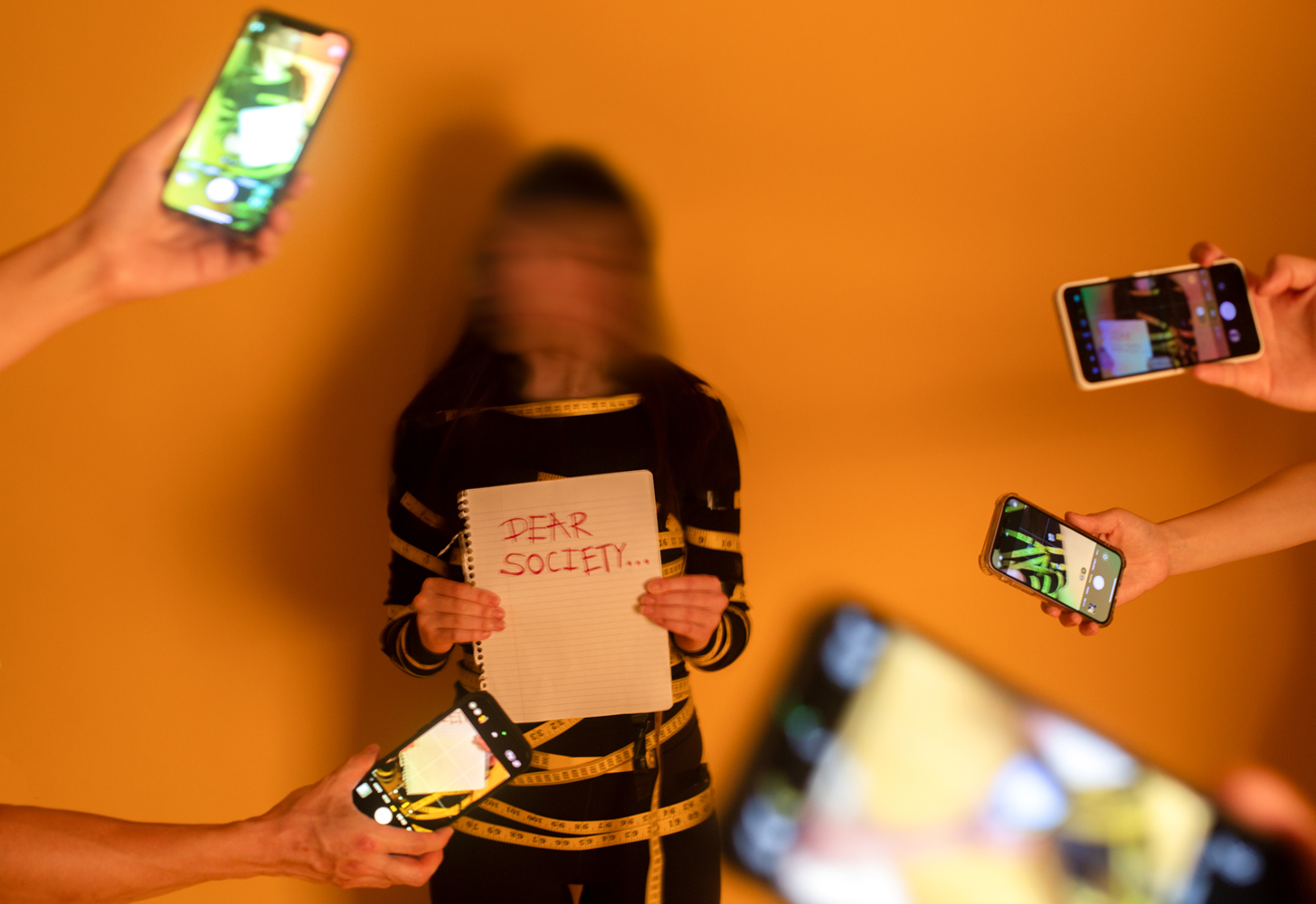 As a teenage girl, I find myself constantly exposed to idealized and manipulated images on social media, and I can’t help but feel self-conscious. In this photograph, I used the yellow measuring tape to symbolize the suffocating influence that society and its unrealistic beauty standards have on us. The girl’s face is blurred because she is losing both her sense of self and confidence while striving to conform to these standards. She wants to break free from the overwhelming pressure, yet those around her treat her plea with indifference, downplaying it as if it were mere entertainment. Will society ever truly acknowledge her inner turmoil?