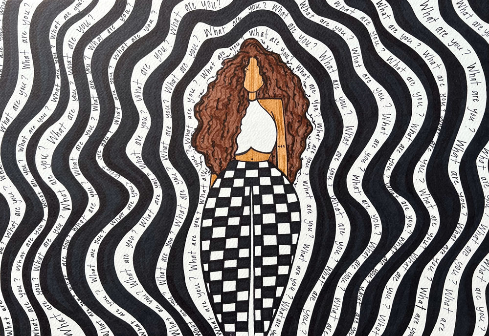 This piece of work is about being biracial and confused. As I get older, it’s like I am having one huge identity crisis, but it's been my entire life. How many of us have been asked, 'What are you?' Let's all collectively roll our eyes. How many boxes am I allowed to check? Do I have to choose just one? What am I? I'm still trying to figure that out. This piece was created to describe my personal experience as a black and white woman: confusing and alienating, yet empowering and beautiful.