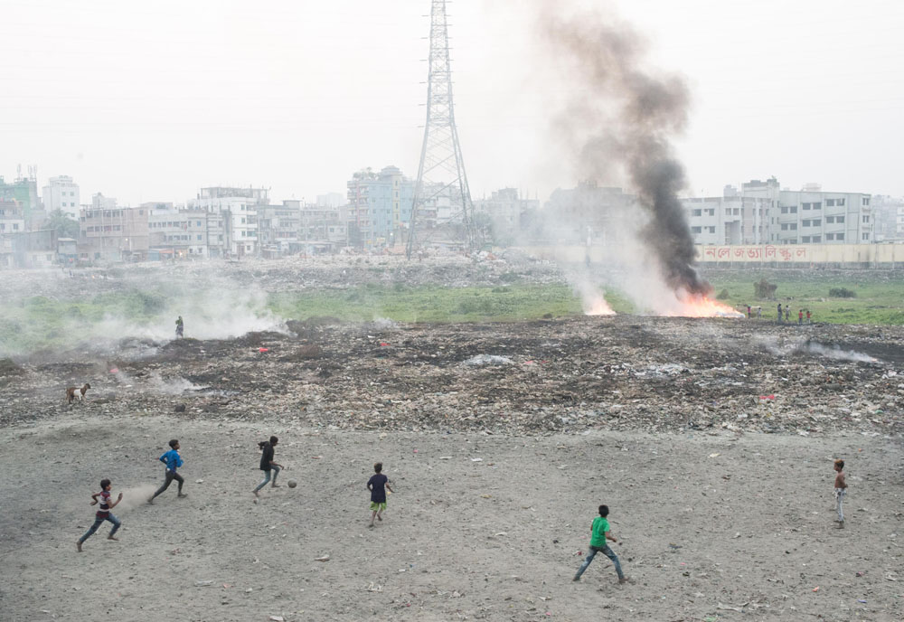 Street children playing football in a waste dumping yard at Shikhson, Dhaka, Bangladesh.