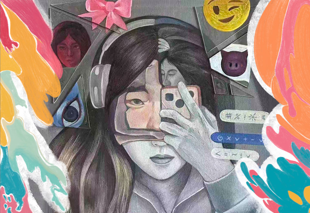 In the consciousness of adults, they need teenagers to be simple: obedient and submissive, and teenagers are used to fighting this stereotype with silence. But the truth is, really get into each teenager and you'll realize that each of them possesses a rich world. Like me in the painting, I am a loner in my own world, wearing various masks. Each face in the painting is a unique shape, each click is a new performance, each gaze is a new period of self-examination. We are hovering on the edge of illusion and reality, showing or hiding ourselves with a thousand different faces, conversing with the world with different identities, diverse images, rich words, as well as pictures and emoji, and recognizing our multi-faceted selves and the complex world. In the age of the Internet, teenagers have been reconceptualized.