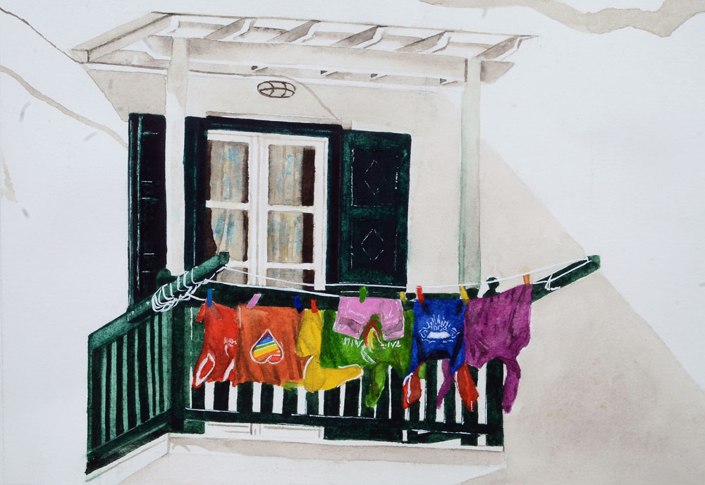 I’ve gotten to know a bit about the people in my neighborhood by observing the contents of their clothesline. I always enjoy surveying the range of bath towel colors and sheet patterns. Sometimes I amuse myself by imagining stories about the lives of the people who wear the disembodied clothing I see swaying on a line. The subject in my painting is embracing authenticity in a unique way. Coming out is a time of celebration, reflection, and authenticity for an individual as well as for society - breaking the silence is about claiming your own sense of self-worth and refusing to let societal norms dictate how you live your life. True acceptance starts with self-acceptance. Only when we accept ourselves can we be ready to accept others.