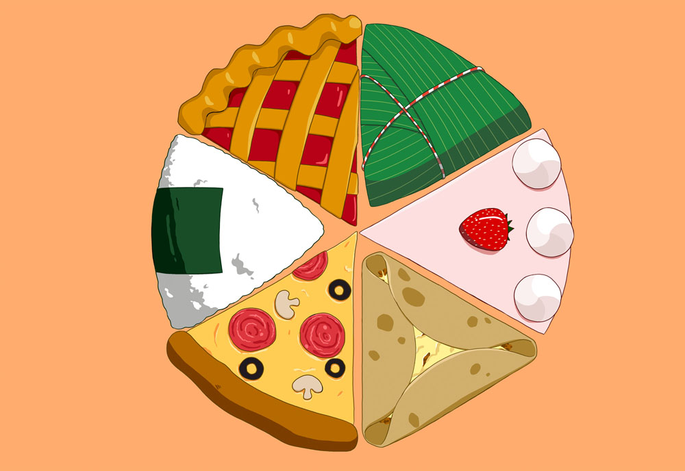 I chose foods from different cultures to represent people’s differences. Everyone tries new food to “spice up” our daily lives. Different personalities and backgrounds of people are like different tastes and forms of food. If we accept them, we can receive surprises and a broader view in return. I placed these foods in a circular shape to imply that we can form a circle of harmony despite our differences.