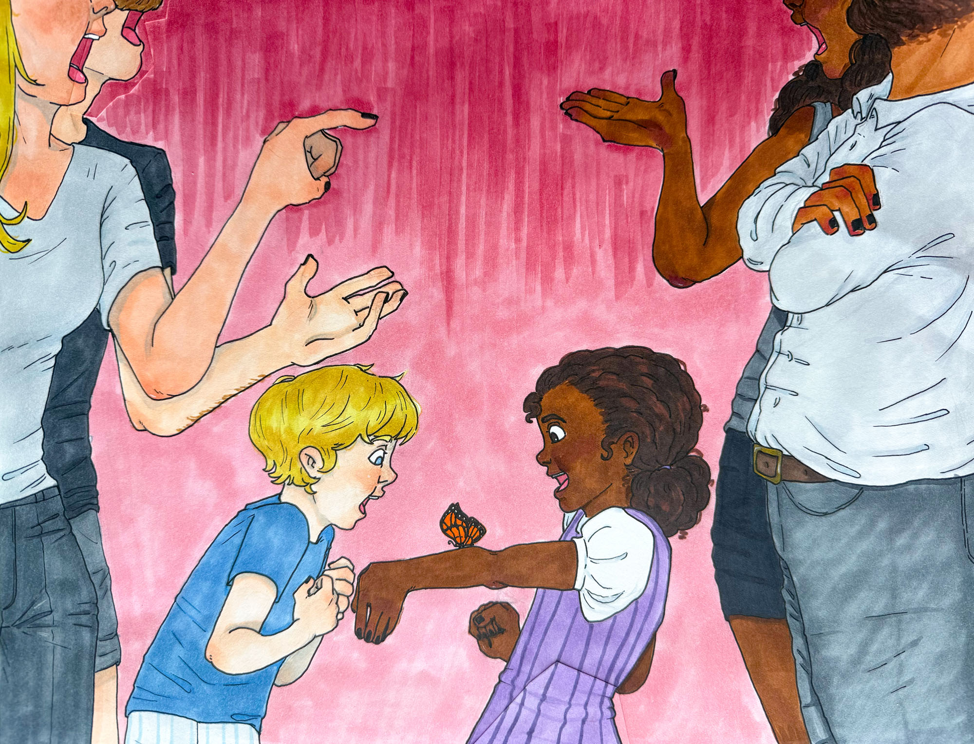 This piece is a representation of how those who hate and only see our differences are only hurting themselves. When we focus on the things that are hate, jealousy, judgment, we miss out on the many, many, many beauties of life. If we were to simply look through the eyes of young children who see no difference, we would enjoy life all the more. I chose red and pink for the background because they are the same color, yet they can mean completely different things. Showing we are all human with the choice between love and hate. I also decided to draw a butterfly out of all bugs, representing a great need for change and growth in our world. Thank you for your time and consideration.